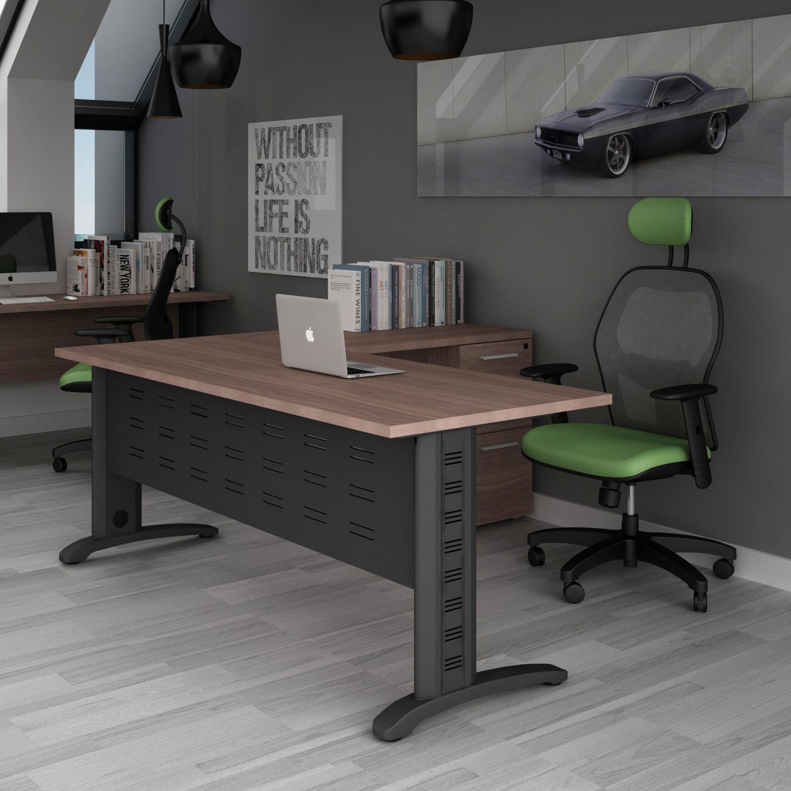 Estación de trabajo ejecutiva en forma de “L” TECH gris-negra. Superficie principal tipo Palermo, lateral Recta acabada en laminado plástico, base metalica en “L” importada color Gris. Incluye Modesty Panel troquelada metalica en color Gris. Un pedestal de dos papeleros y uno de archivo en laminado plástico, con jaladera.